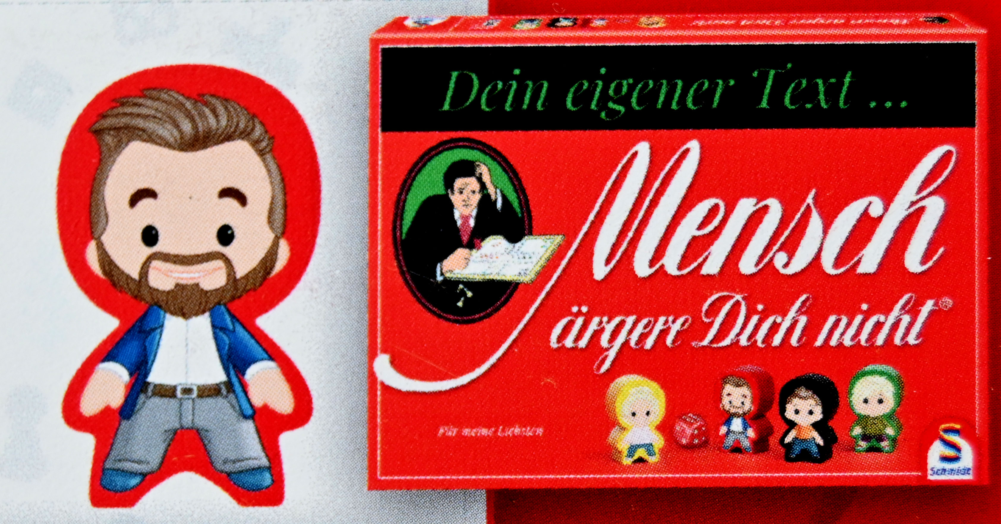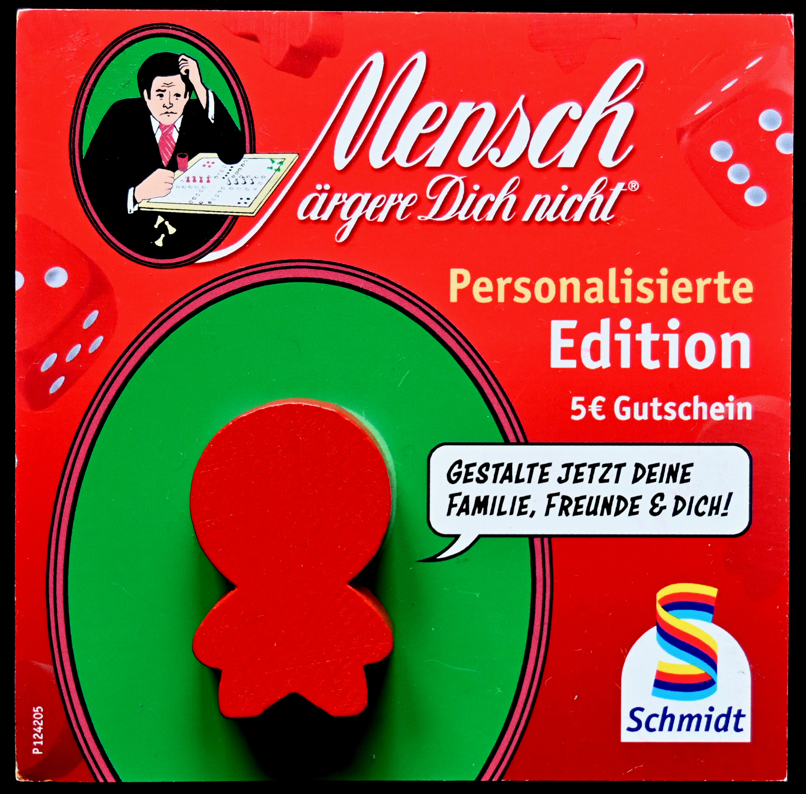 | Im Jubiläumsjahr 2024, als "Mensch ärgere Dich nicht" 110 Jahre alt wurde, hat die Firma Schmidt eine personalisierte Edition von "Mensch ärgere Dich nicht" herausgebracht. D.h., man kann sein eigenes "Mensch ärgere Dich nicht" kreieren. Dazu gab es die unten stehende Werbekarte auf der MEsse in Nürnberg. | |||||||||