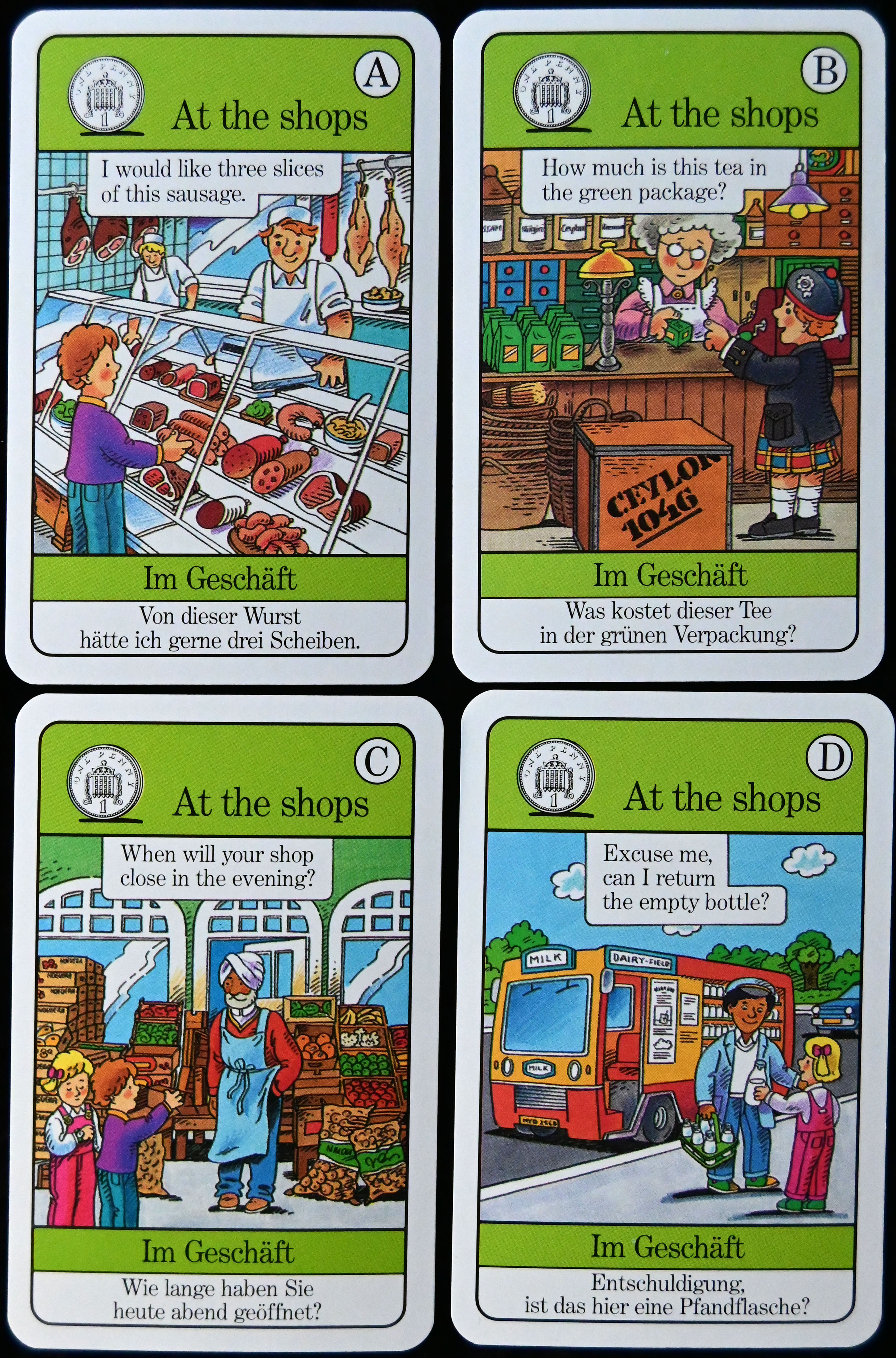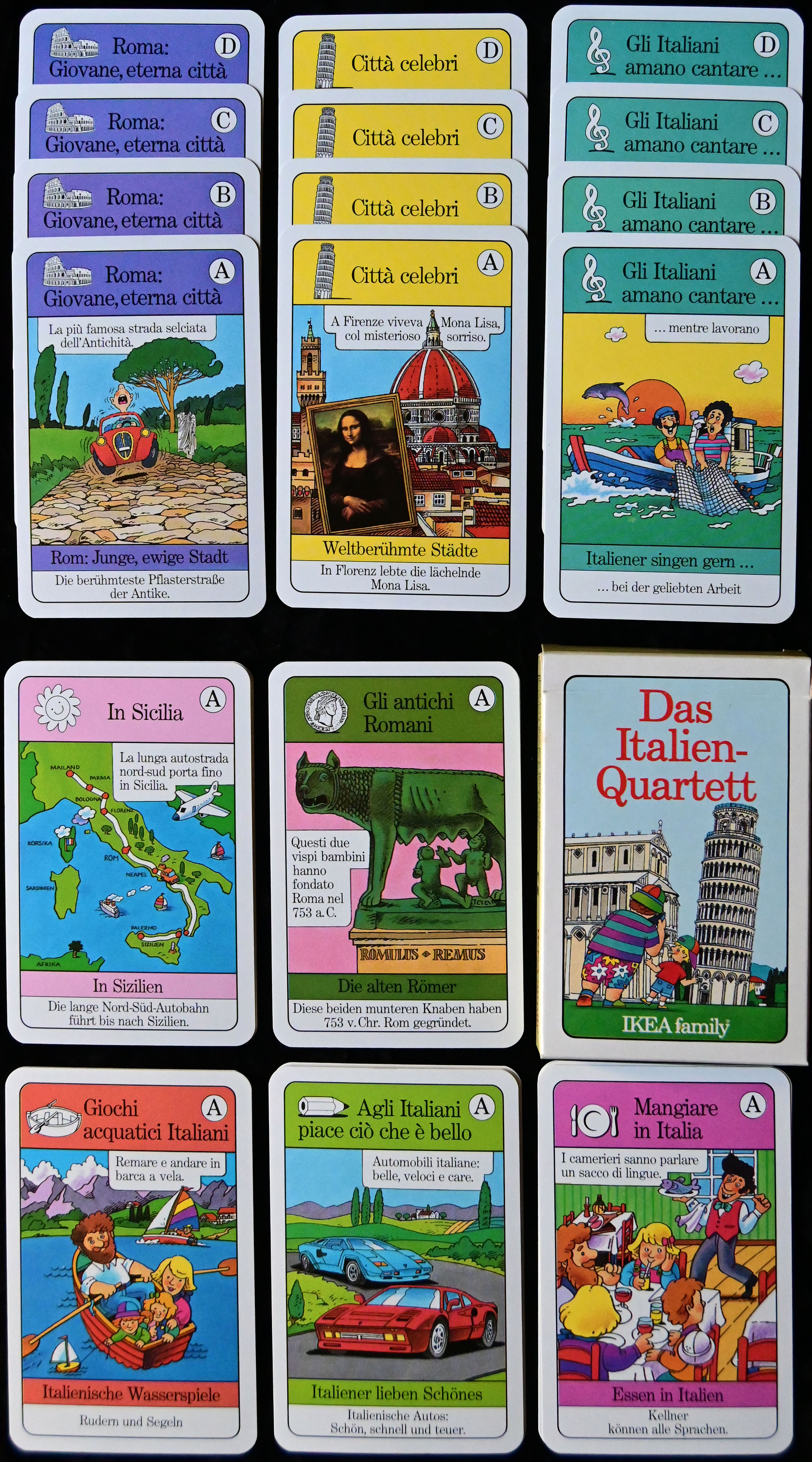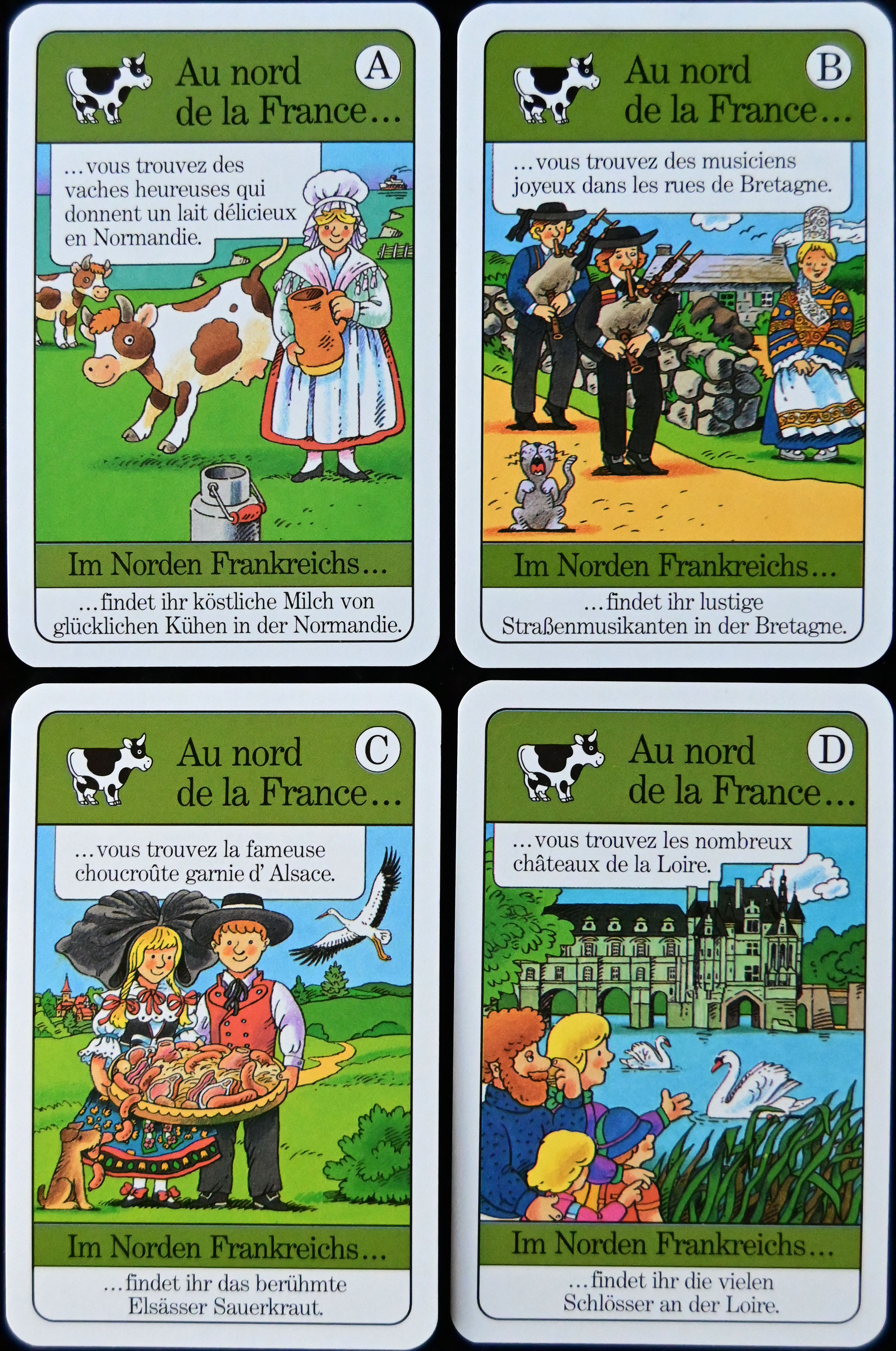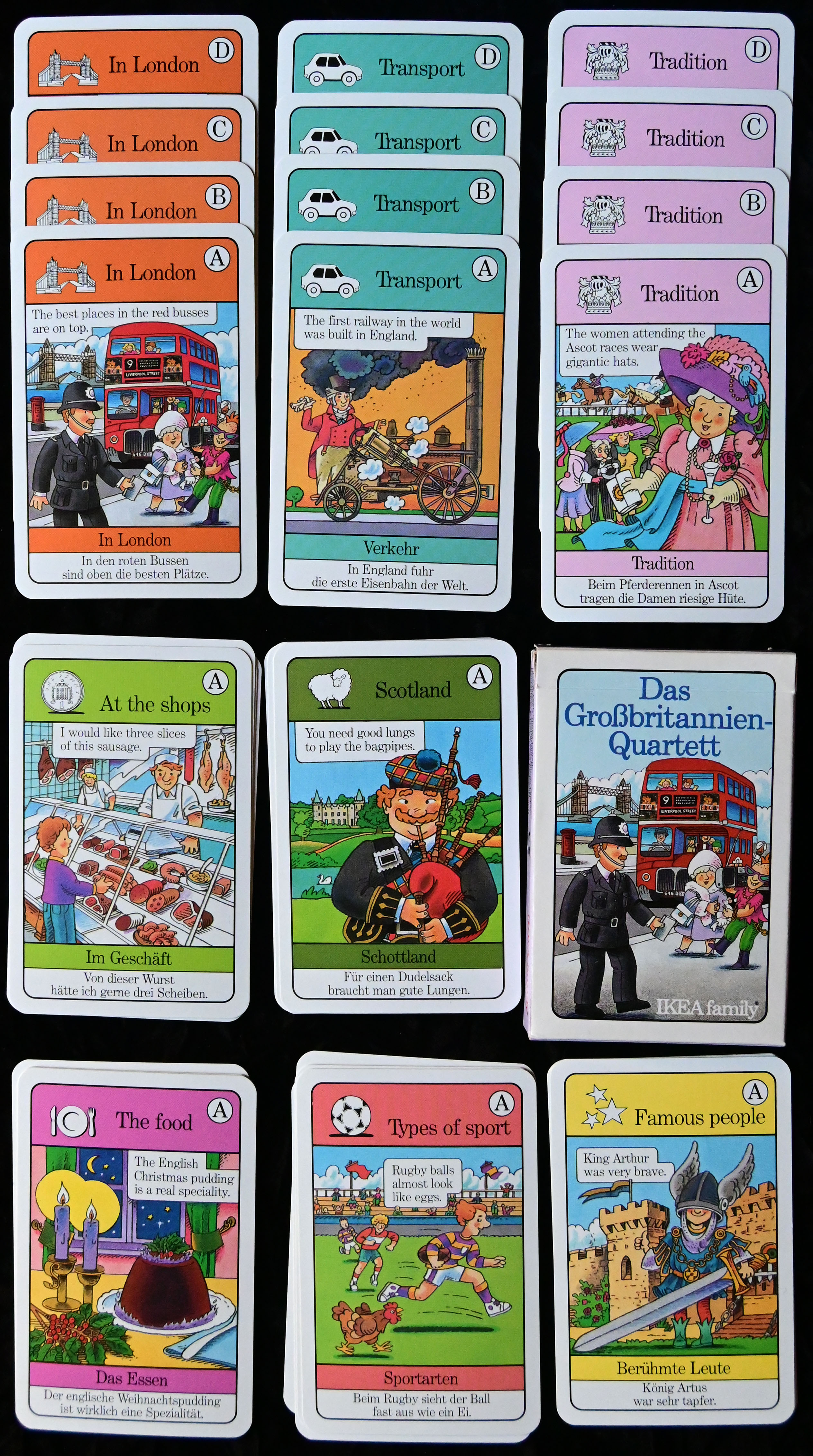 Die jeweils vier Karten, die zu einem Quartett gehören, enthalten, in der richtigen Reihenfolge nacheinander gelesen, eine kurze Geschichte, die zum jeweiligen
