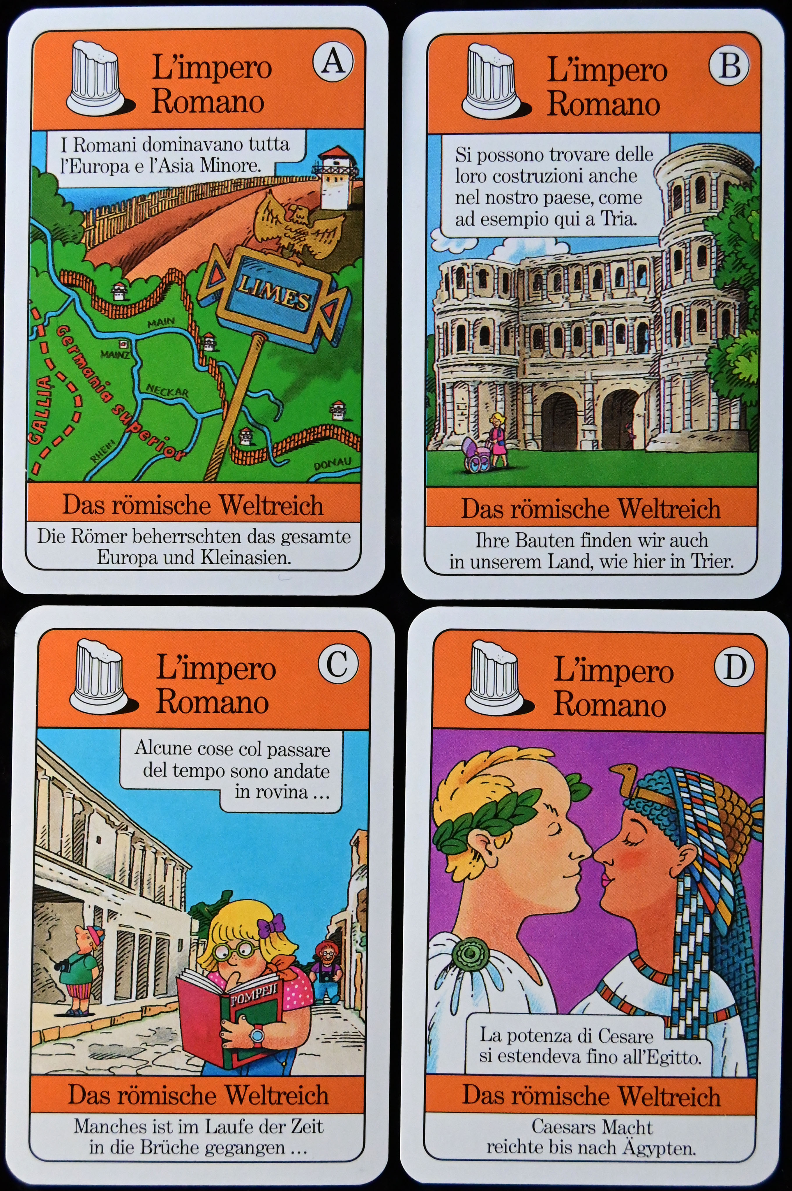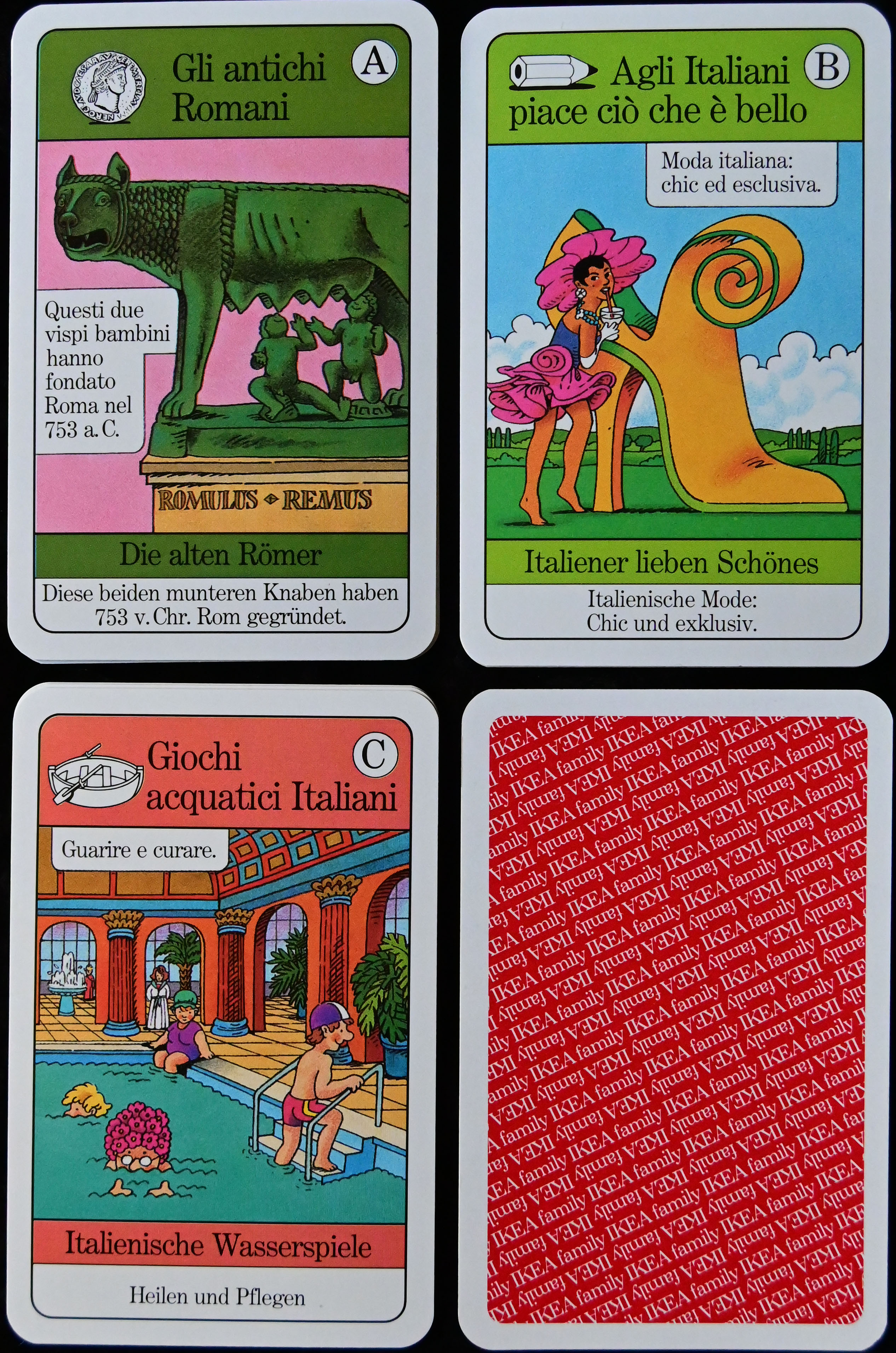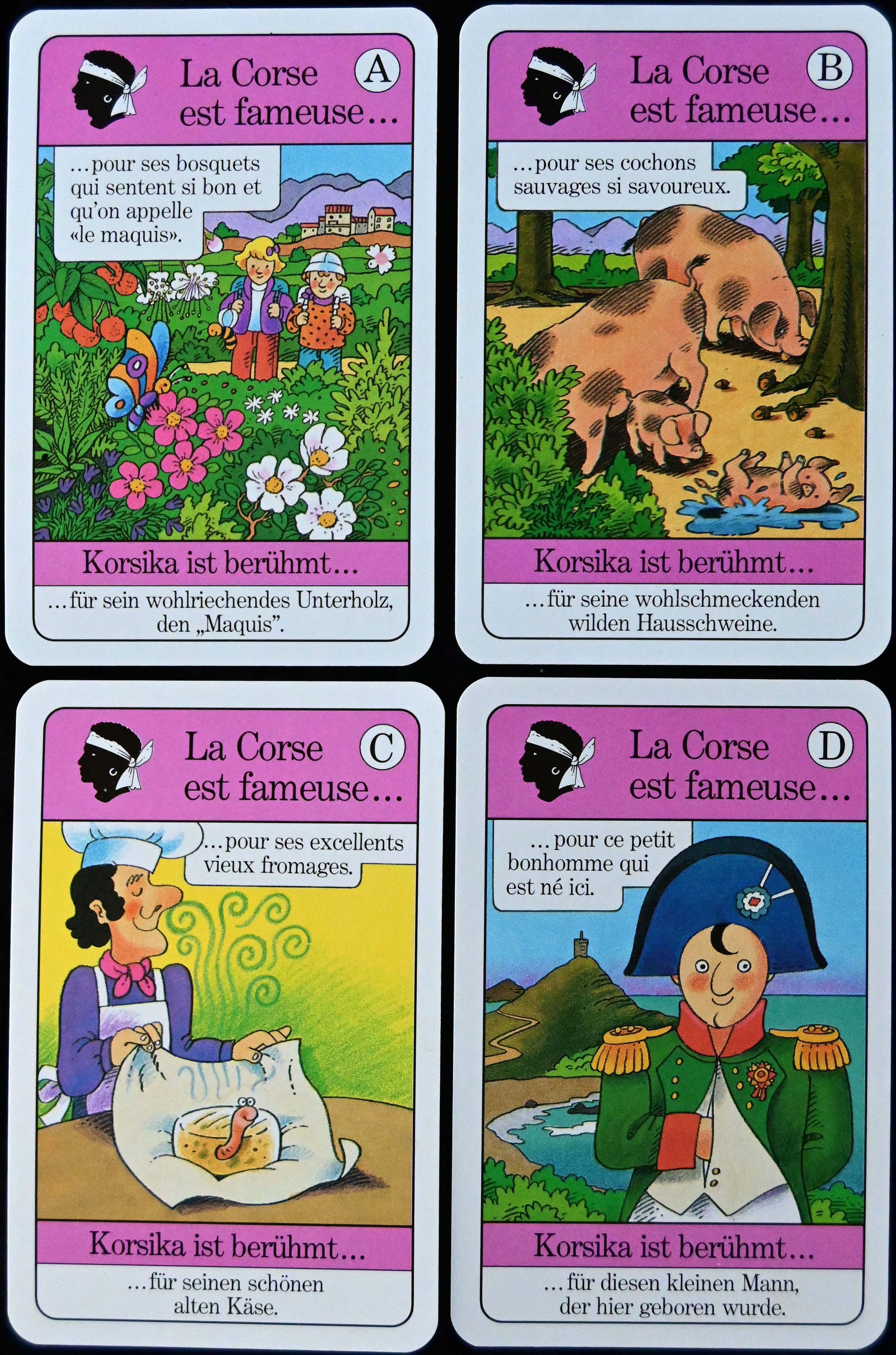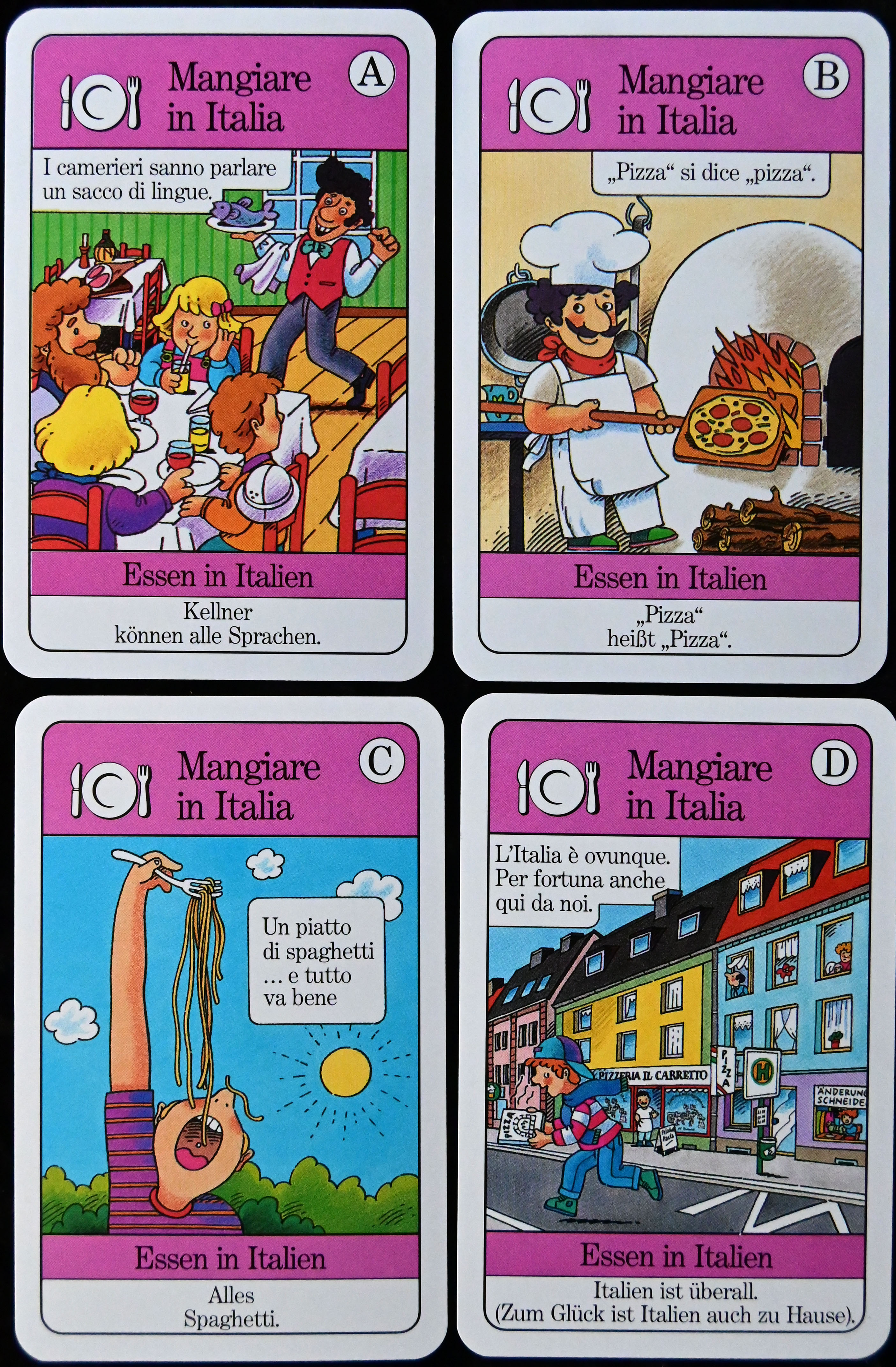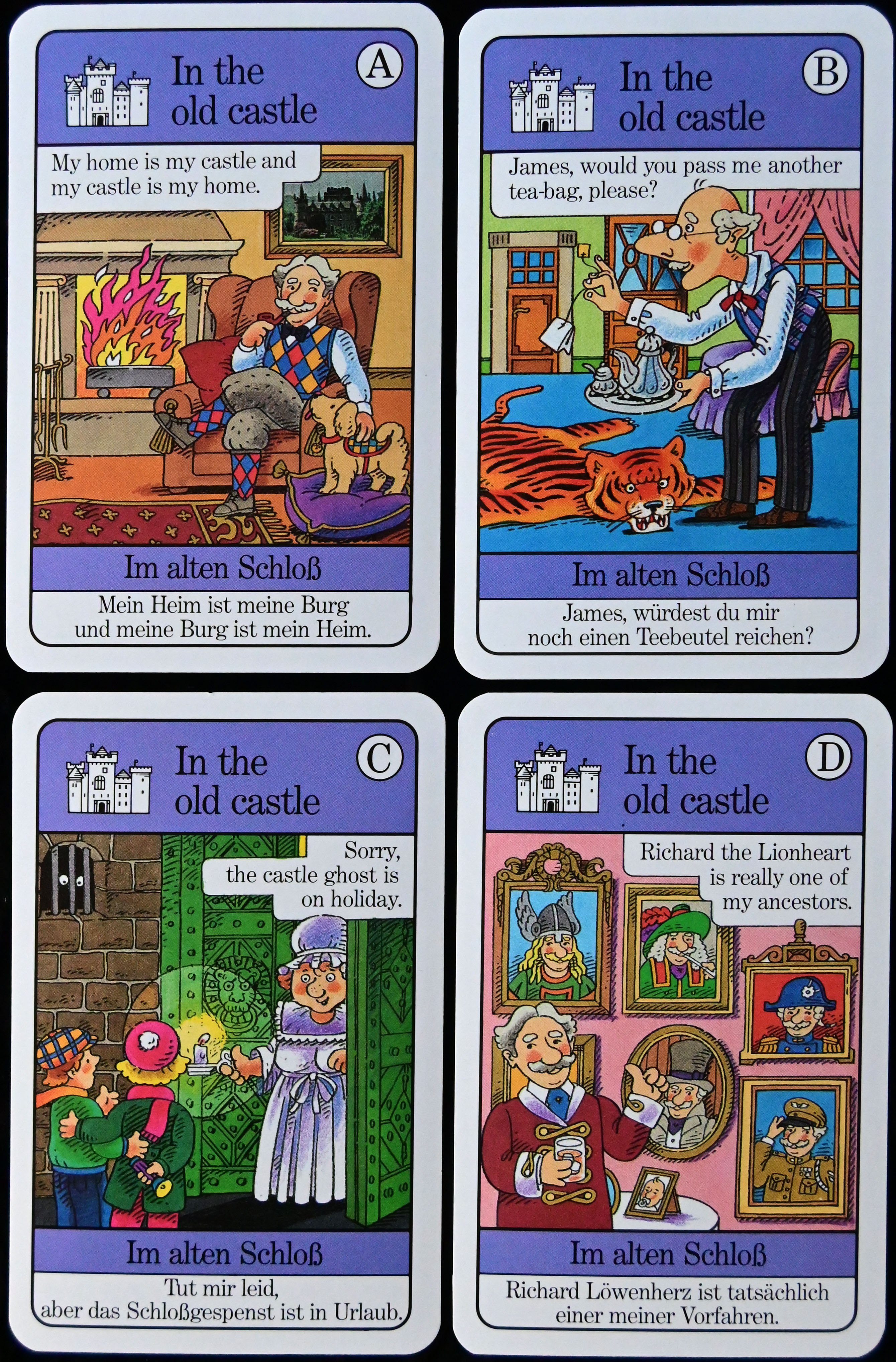 Die jeweils vier Karten, die zu einem Quartett gehören, enthalten, in der richtigen Reihenfolge nacheinander gelesen, eine kurze Geschichte, die zum jeweiligen